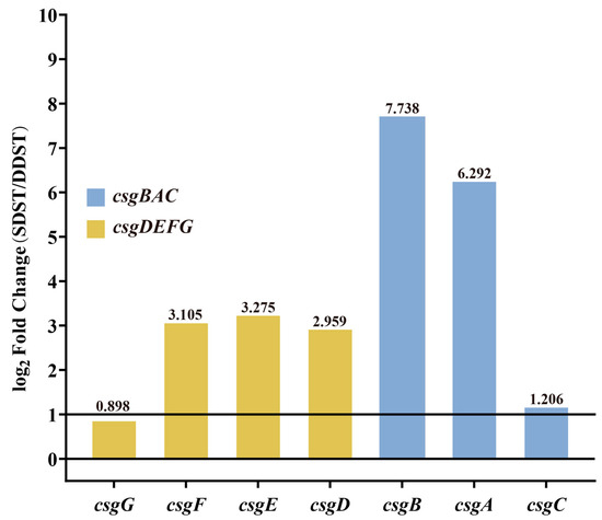 The cut-off for differential expression was set as q value < 0.05 and a |log2(FoldChange)| > 1. A total of 179 differentially expressed genes were identified in the transcriptome comparison between the SDST and DDST groups cultured under biofilm induction conditions, including 67 upregulated genes and 112 downregulated genes. Due to the more pronounced rdar biofilm morphology in SDSTs, attention was focused on genes that were upregulated in SDSTs. Five of the top ten genes (csgB, csgA, csgE, csgF, and csgD) with FoldChange were members of the csgBAC and csgDEFG operons (Figure 4, Table S6), suggesting that the upregulation of these two gene clusters may be the direct cause of the enhanced radr biofilm morphology.