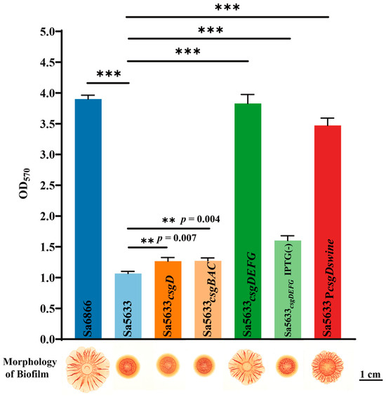 Changes in biofilm formation after overexpression of csgD, csgDEFG, csgBAC, and reversion of csgD promoter point mutations. Subscripts in the strain names indicate overexpression of this gene in the respective strain. Sa5633PcsgDswine was generated by replacing the upstream regulatory region (754 bp) of csgD in Sa5633 with the corresponding region from Sa6866. In crystal violet test, three biological replicates were set up for each group. “**” represents a p-value ≤ 0.01 and “***” represents a p-value < 0.001. Unless otherwise specified with IPTG (-), IPTG was added during cultivation by default.