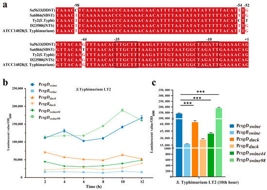 Multiple sequence alignment (a) and activity comparison (b,c) of the csgD promoter. Three biological replicates were set up for each group, and “***” represents a p-value < 0.001. The −10 and −35 regions of the promoter are outlined with black lines. Red bases and red fonts represent sequentially consistent sites, and black fonts represent different bases. (b) Time-course changes in promoter activity. (c) Comparison of promoter activity at the 10th hour. The sample names represent the types of promoters integrated before luxCDABE in pBBRlux plasmid; PcsgDswine: csgD promoter from SDST; PcsgBswine: csgB promoter from SDST; PcsgDduck: csgD promoter from DDST; PcsgBduck: csgB promoter from DDST; PcsgDswine44: T-to-G transversion at position −44 in PcsgDswine; PcsgDswine98: T-to-C transition at position −98 in PcsgDswine.