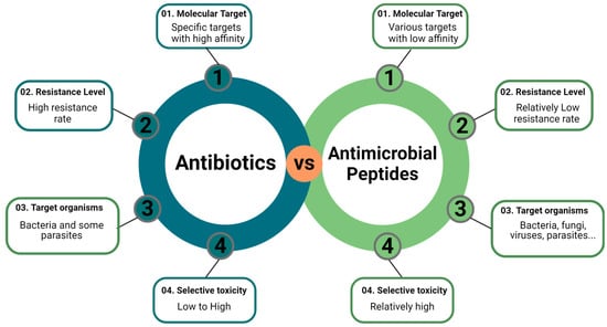AMPs offer several advantages over traditional ATBs [11,14,19,20,21,22,23] (Figure 1), primarily due to their capability to target the challenging non-permeable double membrane of Gram-negative bacteria [24].