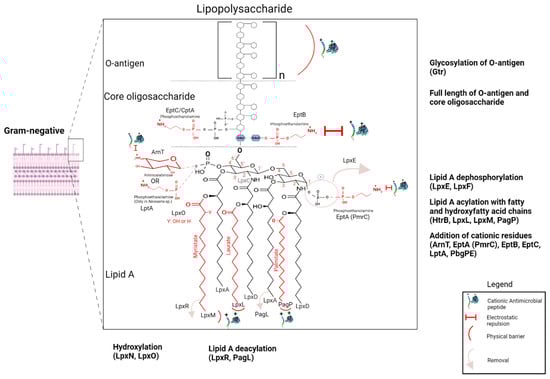 Modifications of LPS for enhanced resistance against AMPs. The position of a substituent or branch is identified by the number of the carbon atom it is bonded to.