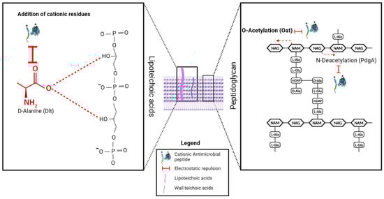 Modifications of teichoic acids, lipoteichoic acids, and peptidoglycans associated with AMP resistance. Enzymes involved in the modification reaction are mentioned between parentheses.