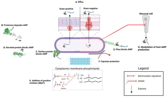 Bacterial mechanisms of AMP resistance not associated with modifications of cell wall structures. (A): Active efflux. (B): Secreted proteinases degrading AMPs. (C): Surface proteins trapping/inhibiting AMPs. (D): Secreted proteins blocking/inhibiting AMPs. (E): Pili-mediated blocking of AMPs. (F): Capsule-mediated protection. (G): Modifications of cytoplasmic membrane phospholipids by the incorporation of cationic residues. (H): Transcriptional downregulation of AMP production by mucosal host cells.