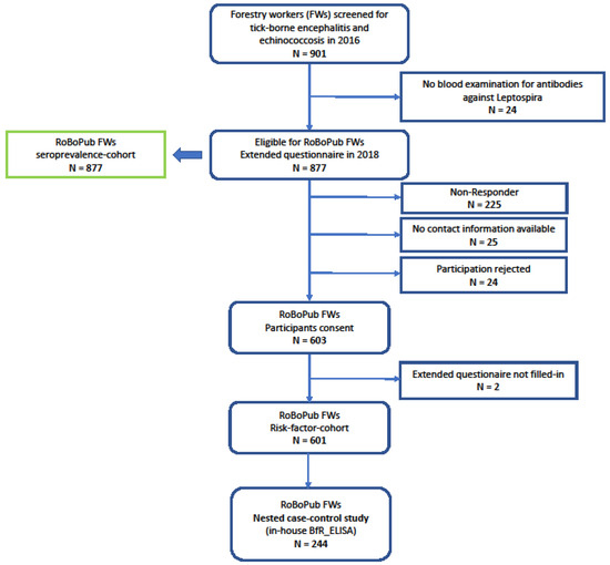 In the course of a biannual serum panel on “Surveillance of Tick-borne encephalitis and Echinococcosis” among forestry workers (FWs), the Public Health Agency of Lower Saxony (NLGA) offered testing on anti-Leptospira IgG to participating FWs within the 2016 round of surveillance. The panel’s protocol comprised serum sampling, a short questionnaire, and written consent. The sera were screened for anti-Leptospira IgG, and the test results were communicated to the FWs in 2017. In 2018, the FWs of the 2016 round were invited to fill in an extended paper-based, standardized questionnaire addressing potential risk factors associated with anti-Leptospira seropositivity (Figure 1).