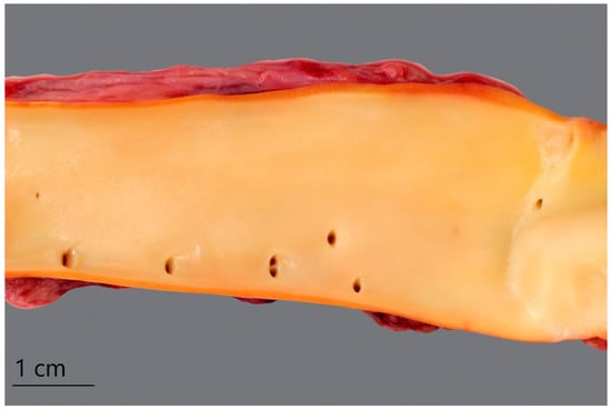 The most frequently described pathomorphological findings in pigs who suffer from acute M. suis-induced IAP reflect the clinically observed icterus in various locations, such as the tunica intima of vessels [3,42,55,56]. As an example, Figure 1 illustrates the yellow discolouration of an aorta obtained from a pig infected with M. suis and suffering from acute IAP [3].