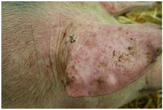 Cutaneous haemorrhages on the ear and ear base of a pig infected with ‘Candidatus Mycoplasma haemosuis’ [35] (figure owned by the authors, license for re-use is granted by John Wiley and Sons, License Number 5810131448483).