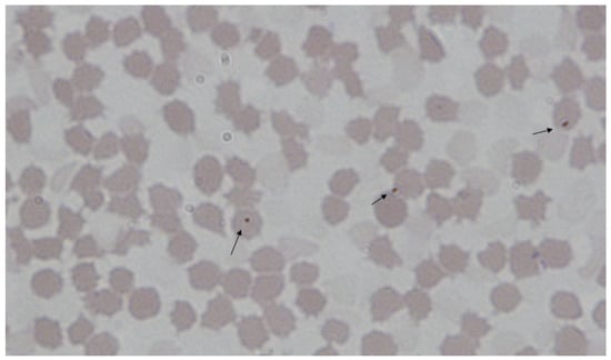 Giemsa-stained blood smear of a pig infected with ‘Ca. M. haemosuis’. ‘Ca. M. haemosuis’ cells occur as small purple dots on the red blood cells (indicated by arrows) [30] (published open access under the terms of the Creative Commons Attribution Non-Commercial No Derivatives (by-nc-nd) License: CC-BY-NC-ND 4.0: https://creativecommons.org/licenses/by-nc-nd/4.0/).