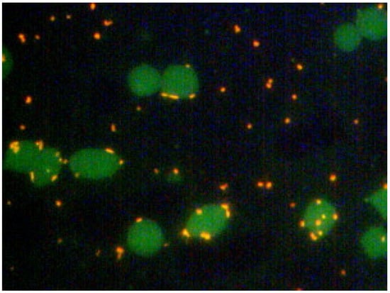 Additionally, fluorescence microscopy with acridine orange-stained blood smears was often used to detect M. suis, where the bacterial cells appear as light-orange dots with a yellow-green undertone [50,51]. An example of an acridine orange-stained blood smear from a pig infected with M. suis is shown in Figure 4 [50].