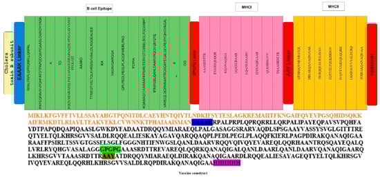 Vaccines designed with antigenic proteins specific to these pathogens possess the ability to provoke specific immune responses, targeting conserved epitopes within the entire antigen while avoiding reactions to non-neutralizing epitopes that may trigger immunopathogenic or immune-modulating consequences [59]. Thirty-one epitopes meeting the criteria of potential immunological activity and safety were linked using GPGPG linkers. These linkers, being rigid, facilitate the effective separation of epitopes. Cholera toxin B subunit which served as an adjuvant was linked with epitopes by the EAAAK linker. The EAAAK linker serves to keep the linked epitopes and adjuvant separate, preventing their folding over each other (Figure 3). Typically, adjuvants are employed to improve the immune stimulation of vaccines, producing improved immune responses such as the induction of antigen presentation, chemokines, and cytokines [60].