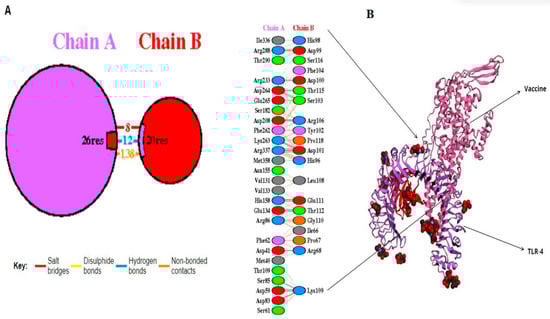 A molecular docking simulation was executed on the ClusPro web server, resulting in the identification of the lowest energy state as well as the sbk8. The sbk8 structure served as a receptor in the molecular docking process of the designed vaccine (Figure 4A). The results of H-bond analysis indicated that specific residue pairs interact with each other, including SER 473- LYS 109, GLU 849- THR 112, GLU 850- THR 112, HIS 1031- GLU 111, ASP 1445- ARG 106, ARG 1650- ASP 100, LYS 1876- ASP 101, ASP 1891- THR 115, ASP 1892- SER 103, and ARG 2483- ASP 101, with distance 3.09, 3.19, 3.01, 3.29, 2.65, 2.82, 3.27, 2.64, and 2.70, as shown in Figure 4B. Moreover, sbk8, a Protein Data Bank (PDB) entry, represents a specific protein structure utilized in the docking analysis (Figure 4B). PDBsum, a pictorial database, provided an overview of the 3D structure deposited in the PDB. We used the PDB-sum for illustration of different interactions. This shows that the vaccine is very effective in triggering an immune response because it binds strongly to the TLR4 receptor on immune cells as shown in Table 3.