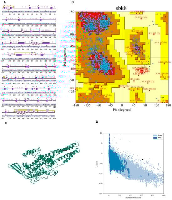 The G-factor analysis provides insights into various structural parameters of the protein [59]. For dihedral angles, the distribution of phi-psi angles showed a score of −0.75, indicating some deviation from the ideal distribution. The chi1-chi2 distribution scored −0.20, while chi1 alone was nearly ideal at −0.01. However, the chi3 and chi4 angles scored positively at 0.58, suggesting a favorable distribution. The omega angle scored −0.22, indicating a slight deviation.