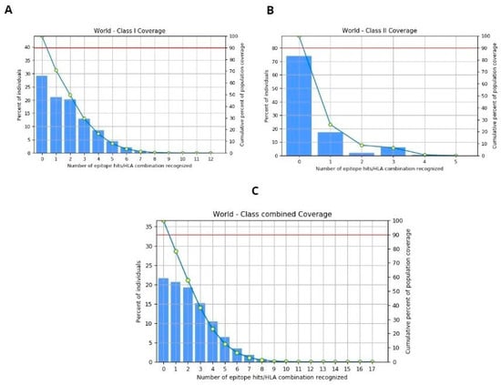 (A) World population coverage for MHC-I. (B) World population coverage for MHC-II. (C) Combined world population coverage for HLA allele recognized as T-cell epitope.