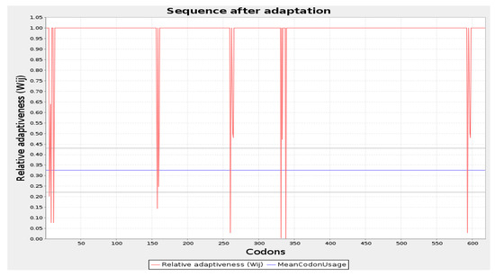 The codon optimization was done by employing the JCAT tool and cloning of the final vaccine. The predicted average Codon Adaptation Index (CAI) value and GC content for the final vaccine were 56.09% and 0.94, respectively (Figure 7). These results suggest that the vaccine construct has been effectively expressed within the E. coli system, indicating successful implementation of the expression process [65]. Subsequently, the SnapGene tool was utilized to incorporate the adapted codon sequence of the final vaccine into the pET28a (+) vector for the construction of the recombinant plasmid (Figure 8).