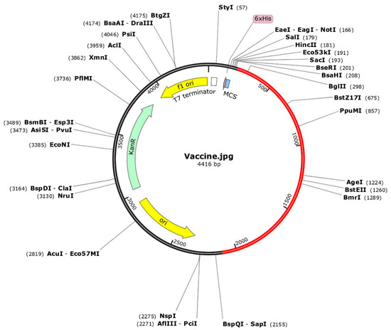 The optimized codons encoding the vaccine protein were in silico cloned into the pET28a (+) vector to facilitate expression in microbial systems. The DNA sequence was inserted into the multiple cloning site of the cloning vector. In the representation, the red portion represents the gene sequence of the designed vaccine construct, while the black portion represents the backbone of the vector. Colored arrows indicate the location and direction of gene expression, with green denoting the kanamycin resistance gene.