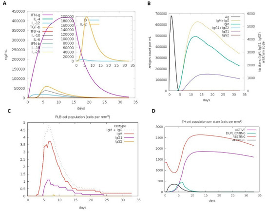 Host immune system computational modeling against designed vaccination. (A) Graph illustrating the synthesis of immunoglobulins. (B) Graph illustrating interleukins and cytokines’ induction. (C) The tally of plasma B lymphocytes is categorized according to their isotypes (IgM, IgG1, and IgG2). (D) The population of B lymphocytes by entity-state.