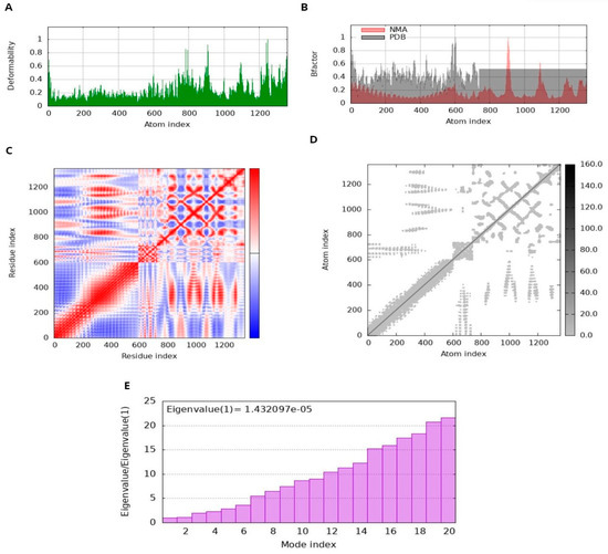 Molecular dynamics (MD) simulation of the docked MEV complex. (A) deformability; (B) B factor; (C) Coherence Index; (D) elastic network analysis; (E) eigenvalue.