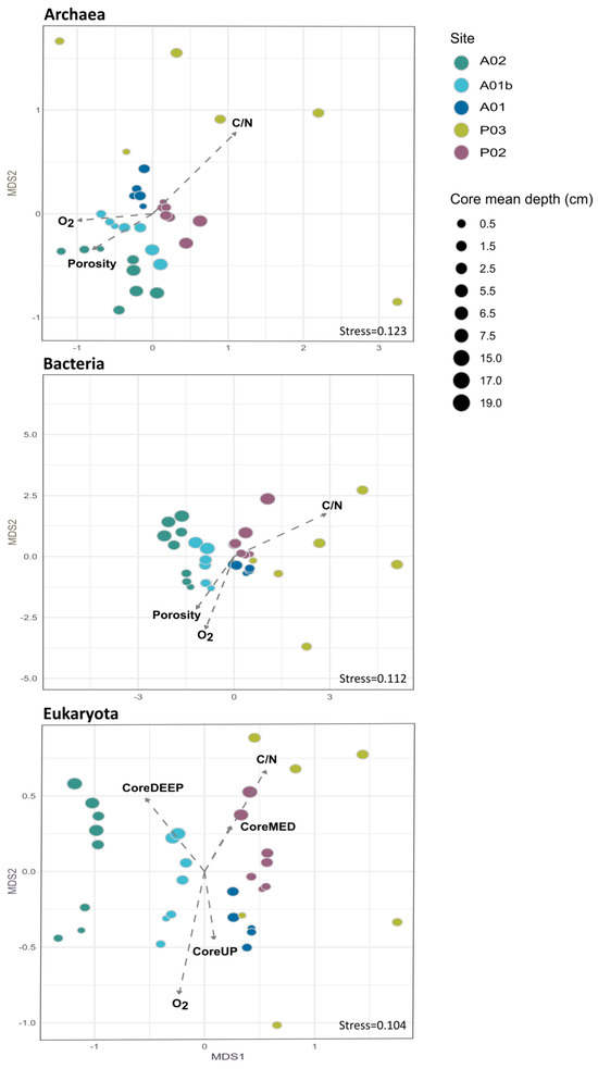 Most of the prevalent ASVs detected (above 10% of samples) appeared at all core depths (UP, MED, and DEEP), including 78.7%, 76.8%, and 51.1% in bacteria, archaea, and eukaryotes, respectively. Unique ASvs of the core depths were negligible and ranged between 0 and 1.5% in bacteria and archaea and up to 6.7% in eukaryotes. In all cases, the UP layer had the highest percentages of unique ASVs in all kingdoms. As may be expected, higher common ASVs were observed between MED and up/deep depths compared to common ASVs between UP and DEEP depths (Figure 4). A comparison of the ASVs between the five sites showed only 7.9% of bacteria, 15% of archaea, and 22% of eukaryotes. ASVs were common to all sites (Figure S1). The unique ASVs in archaea and bacteria were 3.2% and 4.56% in the A02 site, while less than 1% and 2% in the rest sites (respectively). The percentages of unique sequences were higher in eukaryotes at the different sites (2.5–5.7%), except for the P03 site, which had less than 1%.