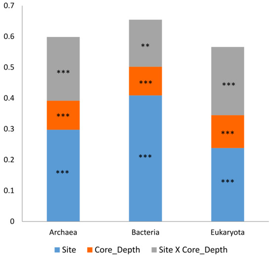 Effect of the site and the core depth on sediment microbiota. PREMANOVA factorial test results. ** p < 0.01; *** p < 0.001.