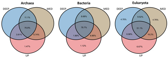 Venn diagrams indicating the distribution of unique and shared microbial ASVs between the core depths (DEEP, MED, and UP). ASVs with prevalence >10% of samples were included. Only values above 1% are shown.