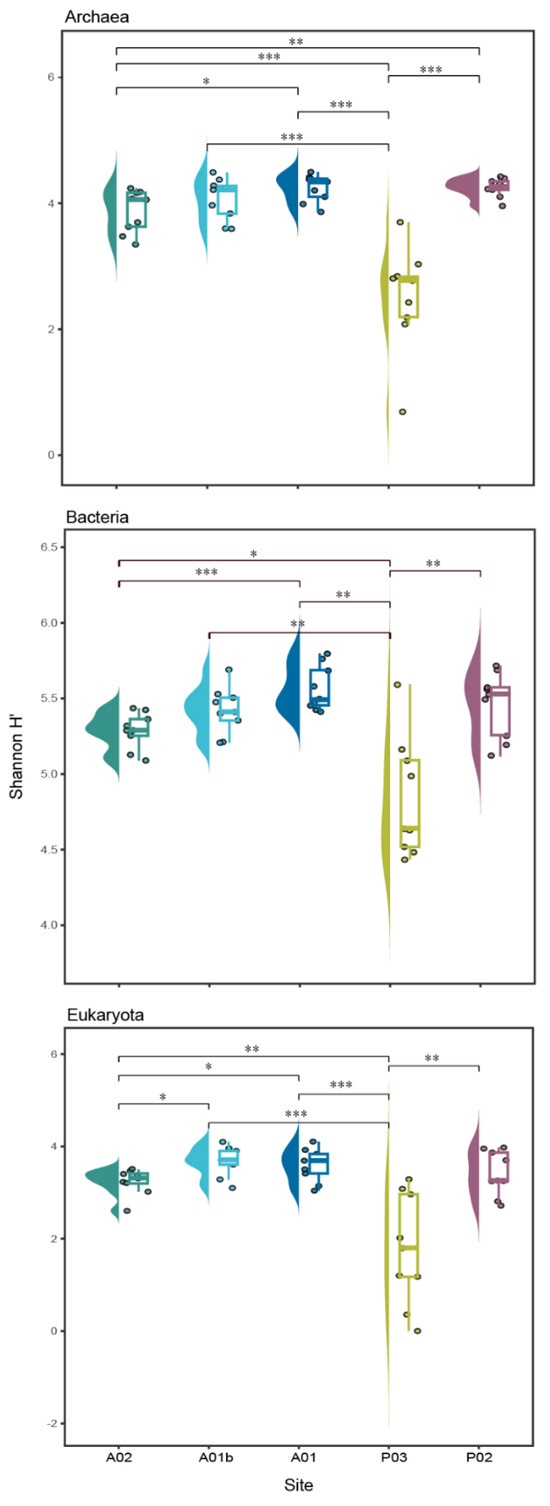 Boxplot presenting the distribution of Shannon H’ index of diversity within each site at each kingdom. * p < 0.05; ** p < 0.01; *** p < 0.001.