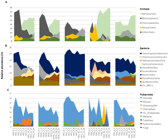 Composition and structure of sediment microbiota in the sampled sites. (A) Archaea class-level composition. (B) Bacteria class-level composition and (C) Eukaryota TAX 2 level. The groups above 6% relative abundance are shown.