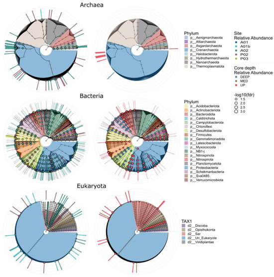 Microbial markers of the site and core depth are presented by a radial cladogram based on the hierarchical taxonomy, colored by phyla (TAX1 for eukaryotes) with the relative abundance in each site and core depth. The markers were identified by the linear discriminant analysis effect size (LEfSe) methods (BH adjusted p < 0.05, LDA > 2).