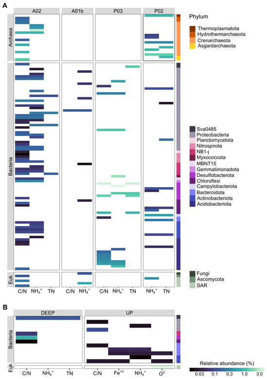 We used Linear discriminant analysis effect size analysis (LEFSe) to search ASVs that exhibit differential abundance patterns in regard to either site identity or core depth. Microbial markers were identified in all kingdoms and included 42, 180, and 32 site markers and 8, 50, and 14 core depth markers for archaea, bacteria, and Eukaryota, respectively (Figure 7 and Table S7). Most of the bacterial markers found were associated with site A02, the farthest marine site (Figure 7 and Figure 8). The markers of archaea were found mainly in the UP layer of the core and belong to the family Nitrosopumilaceae. According to sites, markers belonging to the class Bathyarchaeia were found in sites P02 and A02 sites. Additional markers of A02 belonged to the family Nitrosopumilaceae and the order Hydrothermarchaeales. In Eukaryota, markers were identified mainly in the UP core layer and for sites P02, A02, and A01b, while most of the ASVs belonged to SAR. In contrast to the previous kingdoms, bacterial markers were found in the DEEP layer as well. For example, in the UP core layer, representatives belonged to phylum Actinobacteriota, Bacteroidota, and Proteobacteria (Gammaproteobacteria and Alphaproteobacteria), and in the DEEP layer, they belonged to Chloroflexi, Desulfobacterota, and Acidobacteriota. Markers were found mainly in sites A02 (e.g., Proteobacteria (Alphaproteobacteria and Gammaproteobacteria) and NB1-j), P03 (Acidobacteriota), and P02 (Proteobacteria and Desulfobacterota). In order to identify ASVs significantly associated with chemical properties (e.g., C/N, TN, NH4+, and O2), a linear decomposition model (LDM) analysis was performed. Figure 8 shows the correspondence between site/core depth specificity and sediment chemical parameters. We found that 153 ASVs in total correlated with sites 23, 124, and 6 (archaea, bacteria, and Eukaryota, respectively) and with a core depth of 12 markers for bacteria and 1 for Eukaryota. Common ASVs were identified in four sites and included only the three parameters: C/N, NH4+, and TN. Most markers were found in site A02 in all kingdoms and were correlated mainly with C/N and NH4+. ASVs shared between archaea and chemical parameters were found only in sites A02 and P02, with most belonging to Crenarchaeota. Site P03 included only bacterial markers with the highest relative abundance, mainly class Desulfobacteria. Markers related to the core depth were identified in the upper (mostly) and deep layers and were mainly correlated with C/N and NH4+. In contrast to the site’s markers, we found the upper layer markers that are related to the parameters O2 and Fe+2 as well. The most significant markers were Desulfobacteria with C/N in the deep layer and SAR correlation with O2 in the upper layer.