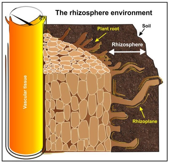 The German agronomist and plant physiologist Lorenz Hiltner coined the word “rhizosphere” (from the Greek “rhiza” = root and “sphere” = field or area of influence) in 1904 to indicate the soil compartment influenced by plant roots (Figure 1). He was convinced that root exudates supported the development of diverse microbial communities that significantly affected plant nutrition [,,,,,]. It is common knowledge that the rhizosphere is one of the most complex ecosystems on Earth []. It represents a biologically active zone and a hot spot for numerous organisms, such as bacteria, archaea, algae, fungi, oomycetes, protozoa, nematodes, arthropods, and viruses [,,,,]. Due to the intrinsic complexity and diversity of plant root systems, the size and shape of the rhizosphere are not defined. The chemical, biological, and physical properties of this environment are not uniform, and these properties vary radially and longitudinally along the root [].