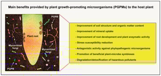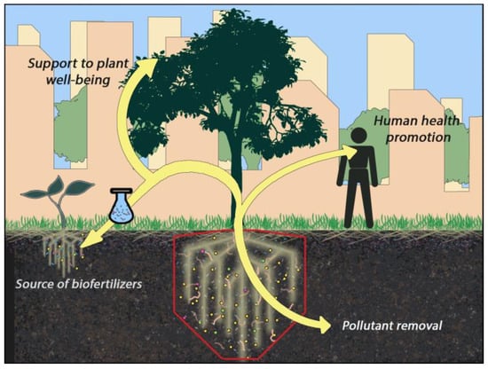 In addition to the removal of pollutants, microorganisms (e.g., bacteria and fungi) may be used as biofertilizers, namely, inocula of beneficial microbes derived from the rhizosphere [,,]. Rapid urbanization, with the consequent decrease in agricultural land area, biodiversity deterioration, climate change, and the excessive use of chemical fertilizers and pesticides in farming practices, have caused significant environmental damage and pose a risk to public health by affecting food security and sustainability in agriculture. Therefore, we must face important challenges in the agricultural field to meet the nutritional requirements of the ever-increasing global population and the growing demand for healthy foods and move toward environmentally friendly practices and sustainable, climate-smart agriculture. Biofertilizers have been designed as valid alternatives to agrochemicals to optimize crop production while preserving environmental health [,]. Due to their plant growth-promoting traits, rhizosphere microorganisms play a crucial role in increasing plant biomass and crop yield under greenhouse and field conditions []. A recent greenhouse experiment demonstrated that a combination of biochar (pyrolyzed organic waste) and PGPMs as biofertilizers (Bacillus velezensis + Saccharomyces cerevisiae thermally inactivated) significantly improved growth and nutrient uptake in silver maple (Acer saccharinum L.) saplings grown in urban soil []. The mycorrhization of Jacaranda mimosifolia D. Don with arbuscular fungi promoted the growth of this ornamental plant under abiotic stresses in urban environments by enhancing its ability to acquire minerals []. Similarly, Rhizophagus irregularis and Funneliformis mosseae AMF had strong positive effects on sour orange (Citrus aurantium L.) growth []. Therefore, microorganisms (particularly rhizosphere microorganisms) represent a valid alternative to chemical fertilizers for improving crop production and plant growth and health while reducing the negative impact of polluting compounds on urban environments, which are generally heavily polluted and subjected to numerous stresses.
