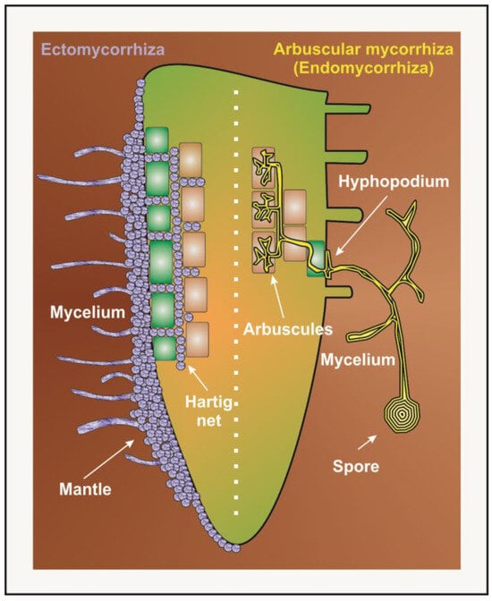Mycorrhizal associations are commonly divided into ectomycorrhizal and endomycorrhizal associations, depending on anatomical traits and plant and fungus taxonomic positions (Figure 3) [].