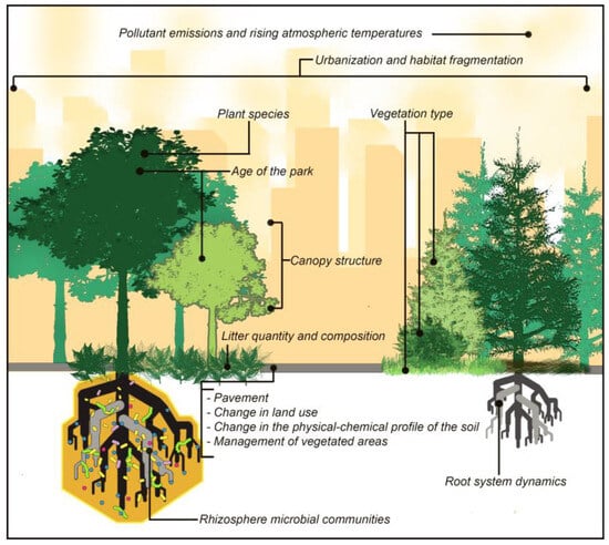 However, if plants exert a preponderant influence on the rhizomicrobiota in natural contexts, the anthropogenic impact becomes the leading factor in shaping the urban soil microbial communities. Human activities such as building and road construction, industrial production, waste management, transport use, and the introduction of new plant and animal species reshape the urban environment and, consequently, the soil as its main component, ultimately affecting the urban soil microbial composition [].