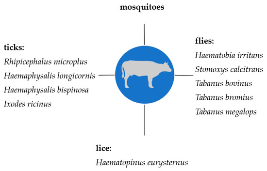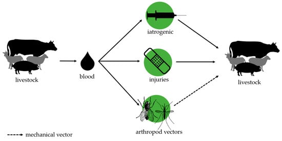 Transmission of HMs mainly includes procedures exposing or sharing blood such as iatrogenic procedures or ranking fights [1,5]. Also, transplacental transmission has been described [21,22]. Blood-independent infections by excretions play a minor role under field conditions [23,24]. Because HMs reside on or within erythrocytes, there is considerable potential for livestock HMs to be taken up by a variety of hematophagous arthropod vectors such as flies, midges, mosquitoes, ticks, and lice [5]. However, experimental proof of HM transmission by arthropods is rare. This review aims to analyze and summarize published data on the transmission of HMs by arthropod vectors in livestock.