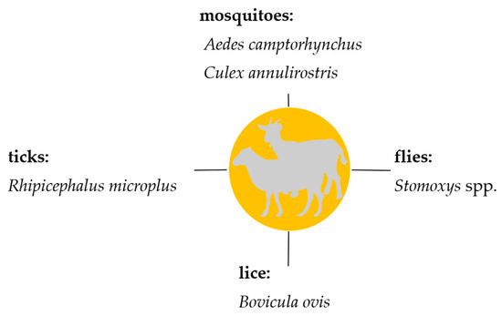 - Daddow, K. Culex annulirostris as a vector of Eperythrozoon ovis infection in sheep. Vet. Parasitol. 1980, 7, 313–317. [Google Scholar] [CrossRef]