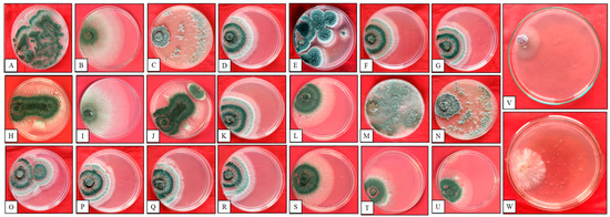 Growth rate of Trichoderma isolates on PDA media. Plates from A–U refer to the Trichoderma isolates PBT1 to PBT21, respectively. V and W are control for FOC and SR respectively.