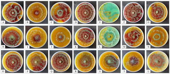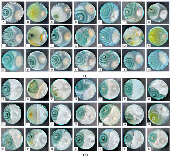 (a) Antagonistic activity of Trichoderma isolates against soil-borne pathogen Fusarium oxysporum f.sp. ciceri (FOC). Plates from A–U refer to the Trichoderma isolates PBT1 to PBT21, respectively. (b) Antagonistic activity of Trichoderma isolates against soil-borne pathogens Sclerotium rolfsii (SR). Plates from A–U refer to the Trichoderma isolates PBT1 to PBT21, respectively.