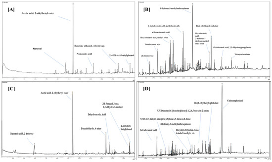 Gas Chromatography-Mass Spectroscopy (GC-MS) of crude extracts of (A) Trichoderma harzianum (RT: 3–15 min), (B) (RT: 15–33 min), and (C) Trichoderma lixii. (RT: 3–15 min), (D) (RT: 15–33 min). RT = Retention time.