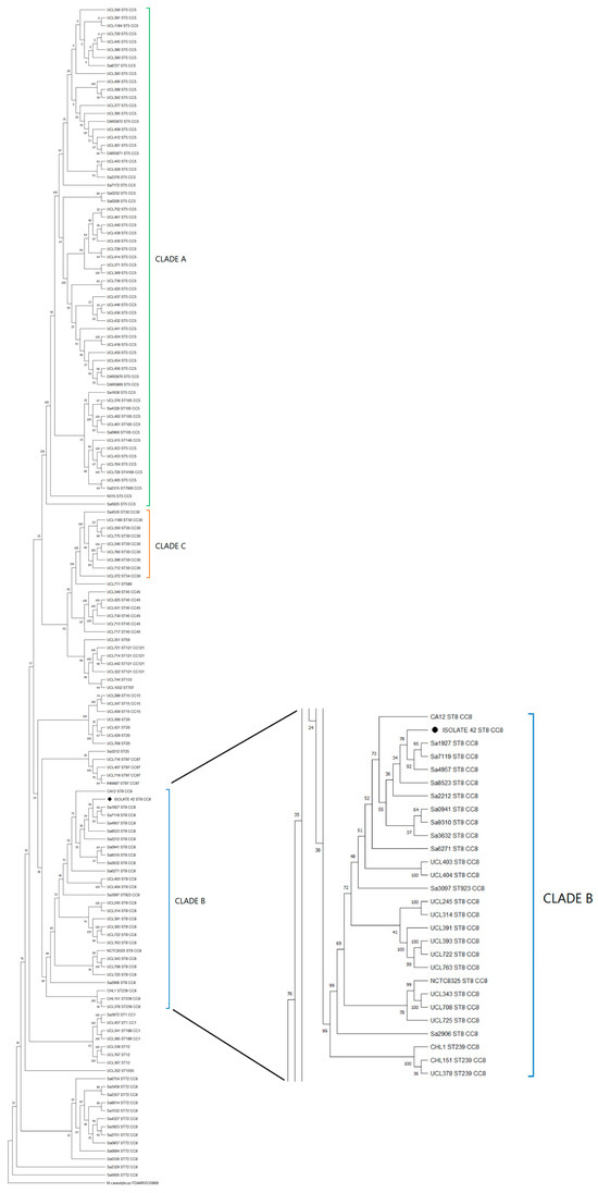 - Enright, M.C.; Day, N.P.J.; Davies, C.E.; Peacock, S.J.; Spratt, B.G. Multilocus Sequence Typing for Characterization of Methicillin-Resistant and Methicillin-Susceptible Clones of Staphylococcus aureus. J. Clin. Microbiol. 2000, 38, 1008–1015. [Google Scholar] [CrossRef] [PubMed]