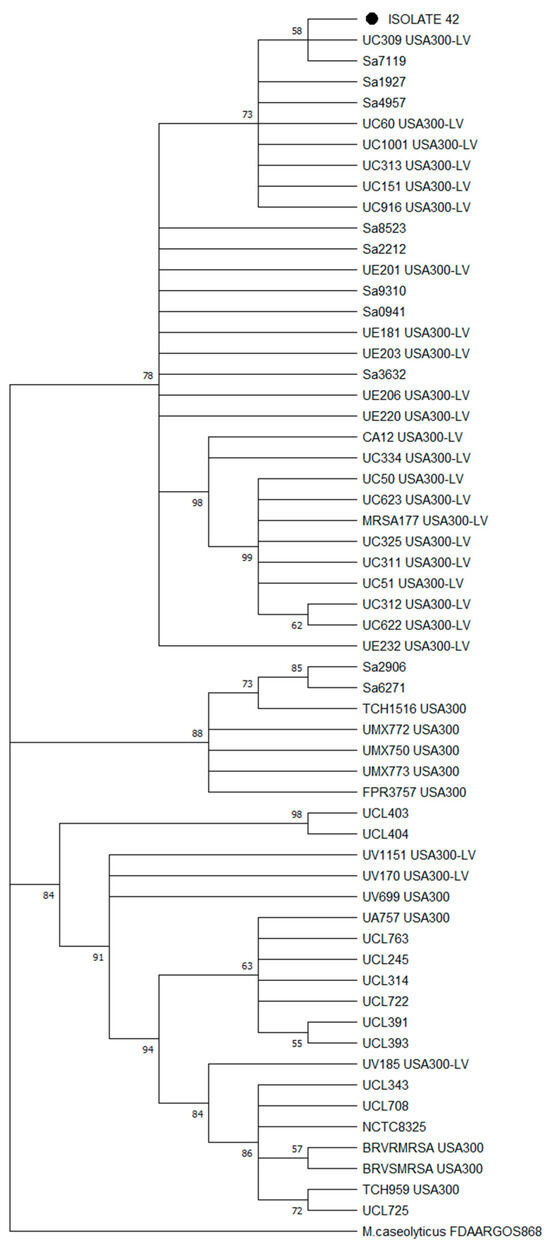 Núñez D, Jiménez P, Cortez-San Martín M, Cortés C, Cárdenas M, Michelson S, Garay T, Vecchiola M, Céspedes A, Maldonado JE, et al. Molecular and Phylogenomic Analysis of a Vancomycin Intermediate Resistance USA300LV Strain in Chile. Microorganisms. 2024; 12(7):1284. https://doi.org/10.3390/microorganisms12071284