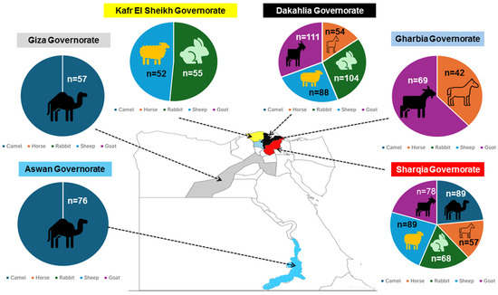 Given the impact of Blastocystis sp. in the population and its zoonotic potential, numerous epidemiological surveys have been carried out worldwide in various animal groups with close contact with humans, in order to identify all potential reservoirs of transmission [12,13,15,39]. However, such studies are still very limited on the African continent, as for instance, in Egypt. Indeed, despite a prevalence of Blastocystis sp. in humans shown to exceed 70% in the north of this country by using molecular detection methods [8], only five surveys have been conducted to date in animals, mainly focusing on poultry, cattle, and pets [45,46,47,48,49]. Globally, the obtained epidemiological data reported an active circulation of the parasite in poultry and cattle, implying that both animal groups could play a role as reservoirs for zoonotic transmission. In contrast, the low frequency or absence of Blastocystis sp. in dogs and cats strongly suggests that pets represent poor host species for the parasite and pose a minimal zoonotic risk of infection to their owners. To complete this overview and improve our knowledge of the molecular epidemiology and circulation of the parasite, a large-scale survey was carried out in six Egyptian governorates (Sharqia, Aswan, Giza, Dakahlia, Kafr El Sheikh, and Gharbia) with the aim of determining the prevalence and ST distribution of Blastocystis sp. in five major groups of animals in terms of population, namely, camels, horses, rabbits, goats, and sheep, all of which live in close contact with the population and may therefore represent potential sources of zoonotic transmission.
