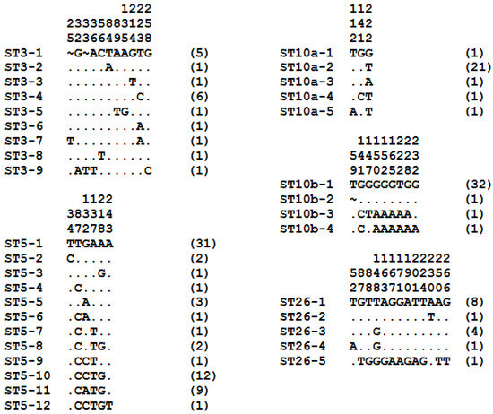 SSU rDNA gene sequence polymorphism between genotypes of some of the most frequently STs and subgroups identified in the present study. The variable positions reported between sequences of isolates belonging to ST3, ST5, and ST26 as well as subgroups ST10a and ST10b are indicated above the alignment (vertical numbering) with respect to the arbitrarily selected reference sequences called genotype STX-1. Nucleotides identical to those of the reference sequences are represented by dashes, and gaps are represented by asterisks. The number of isolates for each genotype is indicated in parentheses on the right of the alignments.