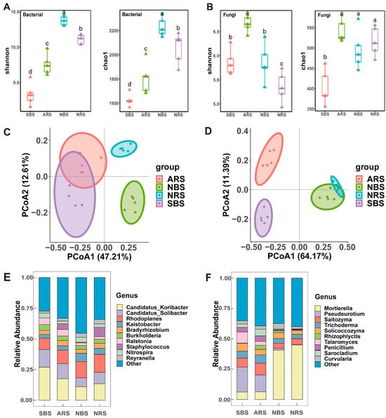 Structure and diversity of the microbial community. (A) The Shannon and Chao1 index of bacterial. (B) The Shannon and Chao1 index of fungi. Different lower-case letters refer to significant differences between each site based on Wilcoxon test (p < 0.05). The PCoA analysis of bacterial (C) and fungal (D) communities based on Bray–Curtis distances. Average relative abundance of bacterial (E) and fungi (F) at the genus level. NRS: normal rhizosphere soil. ARS: affected rhizosphere soil. NBS: normal bulk soil. SBS: stressed bulk soil.