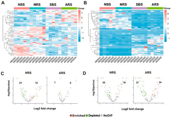 The impact of seawater stress on microbial distribution at the genus level. (A,B) Combined heat level map of the community composition with cluster analysis. Taxa are clustered according to the degree of similarity distributed among different samples and arranged in a vertical order according to the clustering results. The data were standardized using the Z-score method. Red represents the more abundant genera in the corresponding sample, and blue represents the less abundant genera. The volcano plot illustrating the enrichment and depletion patterns of rhizosphere bacterial (C) and fungal (D) microbiomes in the control and seawater-stressed samples. Each point represents a genus. Each red point represents an individual enriched genus, and a green point represents an individual depleted genus. NRS: normal rhizosphere soil. ARS: affected rhizosphere soil. NBS: normal bulk soil. SBS: stressed bulk soil.