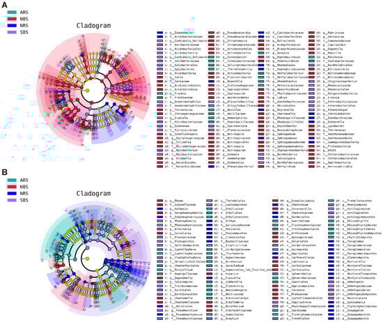 LDA effect size phylogenetic cladogram of bacteria (A) and fungal (B). Taxa with significantly different successions are represented by colored dots, and Cladogram circles represent phylogenetic taxa from phylum to genus. Only the LDA score > 3 for bacteria and >3.5 for fungi are shown. NRS: normal rhizosphere soil. ARS: affected rhizosphere soil. NBS: normal bulk soil. SBS: stressed bulk soil.