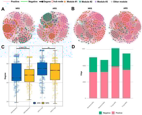 Microbial co-occurrence networks in the rhizosphere. Bacterial (A) and fungi (B) co-occurrence networks in the rhizosphere. Only compositionality-robust (|p| > 0.7) and statistically significant (q < 0.05) correlations are shown. Degree of nodes (C) and number of correlations (D) in the rhizosphere networks. NRS: normal rhizosphere soil. ARS: affected rhizosphere soil. NBS: normal bulk soil. SBS: stressed bulk soil.