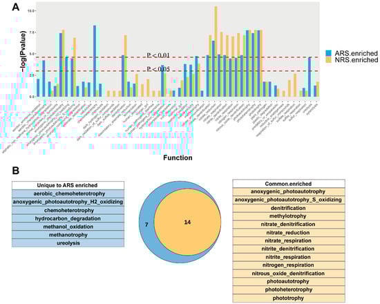 Predicted functional analysis of the tea plant rhizosphere microbiome. (A) Functional predictive analysis of significant enrichment in the rhizosphere using FAPROTAX, respectively. Significant differences between bulk soil and rhizosphere soil were compared using Wilcoxon’s test. (B) Venn diagram of co-annotated and unique functions that were significantly enriched in the rhizosphere of ARS and NRS. NRS: normal rhizosphere soil. ARS: affected rhizosphere soil. NBS: normal bulk soil. SBS: stressed bulk soil.