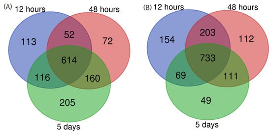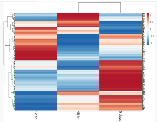 The duck lung raw proteome dataset contained a total of 120,000 MS spectra and 30,000 MS/MS spectra. The 30,000 MS/MS spectra were searched against the NCBI duck proteome database. A total of 2082 proteins were differentially expressed in duck lung tissues infected with the HPAI H5N1 virus at the 1% FDR level. The analysis of the differential expression of proteins at 12 h intervals showed that 876 proteins were upregulated, and 1179 proteins were downregulated. A total of 898 proteins were upregulated, and 1159 proteins were downregulated at 48 h post-infection. At 5 days post-infection, 1095 proteins were upregulated, and 962 proteins were downregulated in duck lung tissues (Table 1). The protein profile showed that 113, 72, and 205 proteins were exclusively upregulated in H5N1-infected duck lung tissue at 12 h, 48 h, and 5 days post-infection, respectively (Figure 1). The downregulation of 154, 112, and 49 proteins was observed exclusively at 12 h, 48 h, and 5 days post-infection, respectively (Figure 1). The fold change value of the upregulated proteins ranged from 11.8 to 1. Interestingly, at the 12 and 48 h time points, a higher number of proteins were downregulated as compared to the 5 day time point post-infection condition (Table 1). The heatmap of the differentially expressed proteins of HPAIV-infected duck lung tissues is represented in Figure 2. This result indicates that many of the host proteins were downregulated at the initial stage of infection, and then later, the host adjusted the cellular homeostasis to recover from the virus-induced differential expression of proteins.