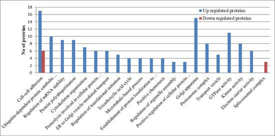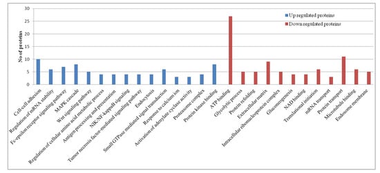 Gene ontology term analysis of the exclusively upregulated and downregulated proteins in duck lung tissues infected with the HPAI H5N1 virus at 48 h post-infection. The GO terms were selected based on a cut-off p value > 0.05.