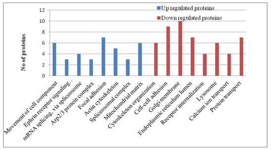 Gene ontology term analysis of the exclusively upregulated and downregulated proteins in duck lung tissues infected with the HPAI H5N1 virus at 12 h post-infection. The GO terms were selected based on a cut-off p value > 0.05.