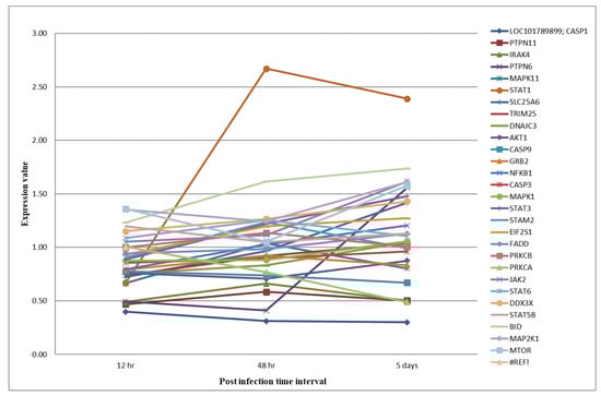 The interferon-induced protein with tetratricopeptide 5 (IFIT5) exhibited anti-viral activity against the influenza virus by sequestering single-strand viral RNA with 5’triphosphate [63]. The IFIT5 protein, at 12 h intervals, was downregulated, and in later post-infection conditions, IFIT5 showed upregulation to counter viral infection. Similar kinds of upregulation were observed in duck lungs and spleens in response to HPAI H5N1 viruses [6,35,64,65]. PKR is an interferon-induced protein with anti-viral, anti-proliferative, and pro-apoptotic functions. PKR is upregulated by the type I and type III IFN signaling pathways [66]. PKR has a known anti-influenza A virus effect by phosphorylating the alpha subunit of eukaryotic initiation factor 2 (EIF2α), which shuts down cellular and influenza A viral protein synthesis, thereby effectively reducing viral replication [67,68]. PKR is highly upregulated in the lungs of HPAI-infected ducks, and the same pattern has been reported (Figure 6) [6,65]. In summary, our datasets showed evidence that protective interferon responses were activated through the stimulation of RIG-I-like receptor signaling and the Jak-STAT signaling pathways, which resulted in the induction of the expression of ISGs (STAT1, STAT3, STAT5B, STAT6, IFIT5, and PKR).
