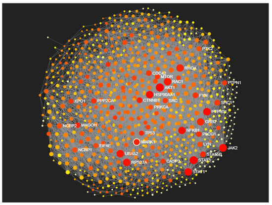 MAPK1 is a member of the MAP kinase family. MAPKs play critical roles in regulating the expression of various pro-inflammatory cytokines, including IL-6 and TNF-alpha, in response to microbial infection [98]. The activation of p38 mitogen-activated protein kinase (p38 MAPK) induces the dysregulation of cytokine expression in HPAIV-infected primary human monocyte-derived macrophages and bronchial epithelial cells [99,100,101]. Further, the inhibition of p38 MAPK significantly reduces the hyperinduction of cytokines and prevents cytokine-induced pathogenicity in HPAIV-infected mice and human macrophages [99,102]. Therefore, interference with the p38 MAPK pathway is also proposed for therapeutic treatments for HPAIV infection [102]. The RPS27A and UBA52 genes code for ubiquitin, and this ubiquitin is a highly conserved protein that has a major role in targeting cellular proteins for degradation in the 26S proteasome [103,104]. Further, the UBA52 host protein interacts with the viral RNA polymerase acidic protein (PA), PA-N155, and PA-N182 and promotes the replication of the highly pathogenic H5N1 avian influenza virus [105].